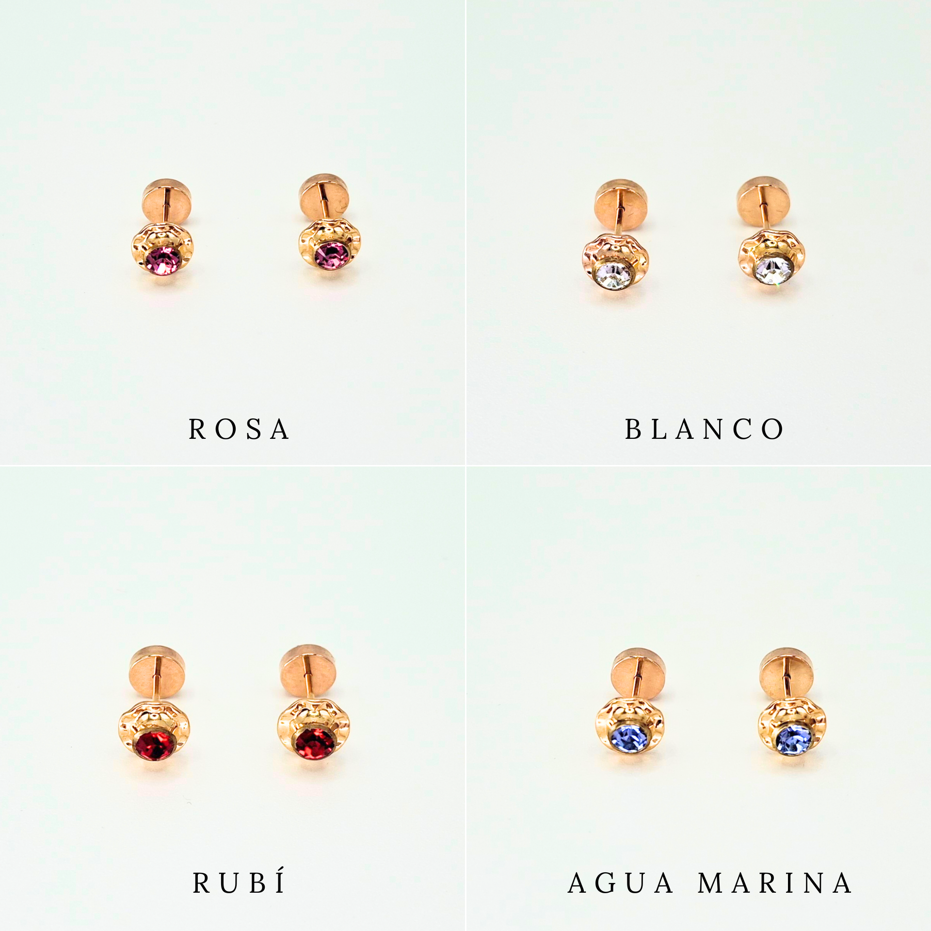 Aros abridores con piedras de circón. Puedes encontrarlos en varios colores. Ideales para bebés, niñas y adultos en perforaciones secundarias de la oreja.