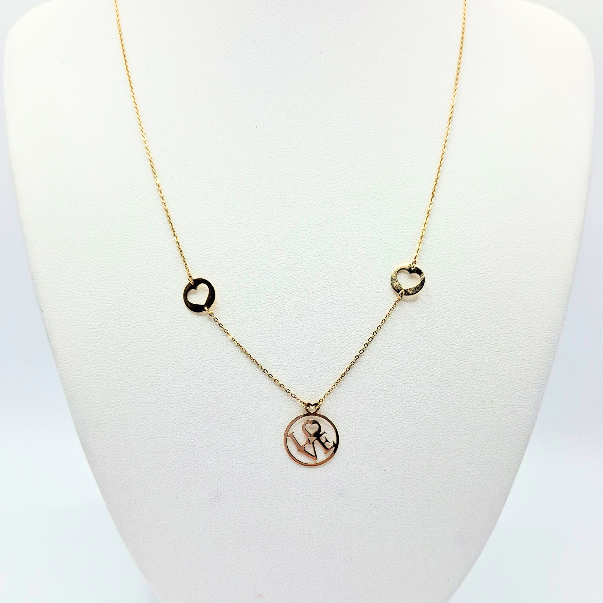 Collar oro italiano de 18k, con cadena forzatina. Contiene un dije de LOVE en medio y dos dijes de corazón a los lados. Una pieza que celebra el amor en todas sus formas.