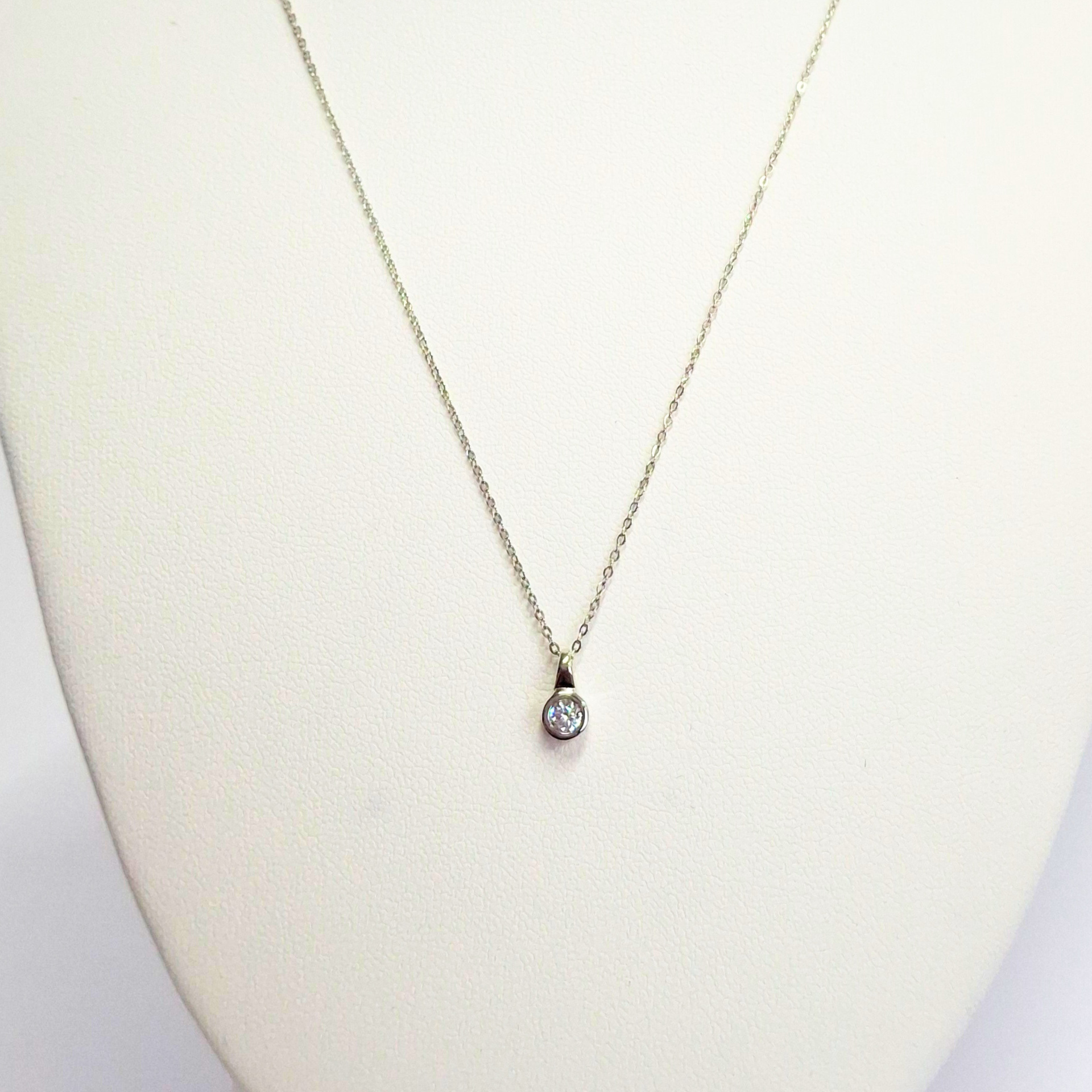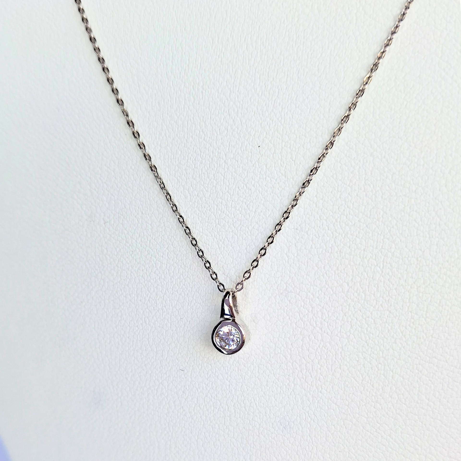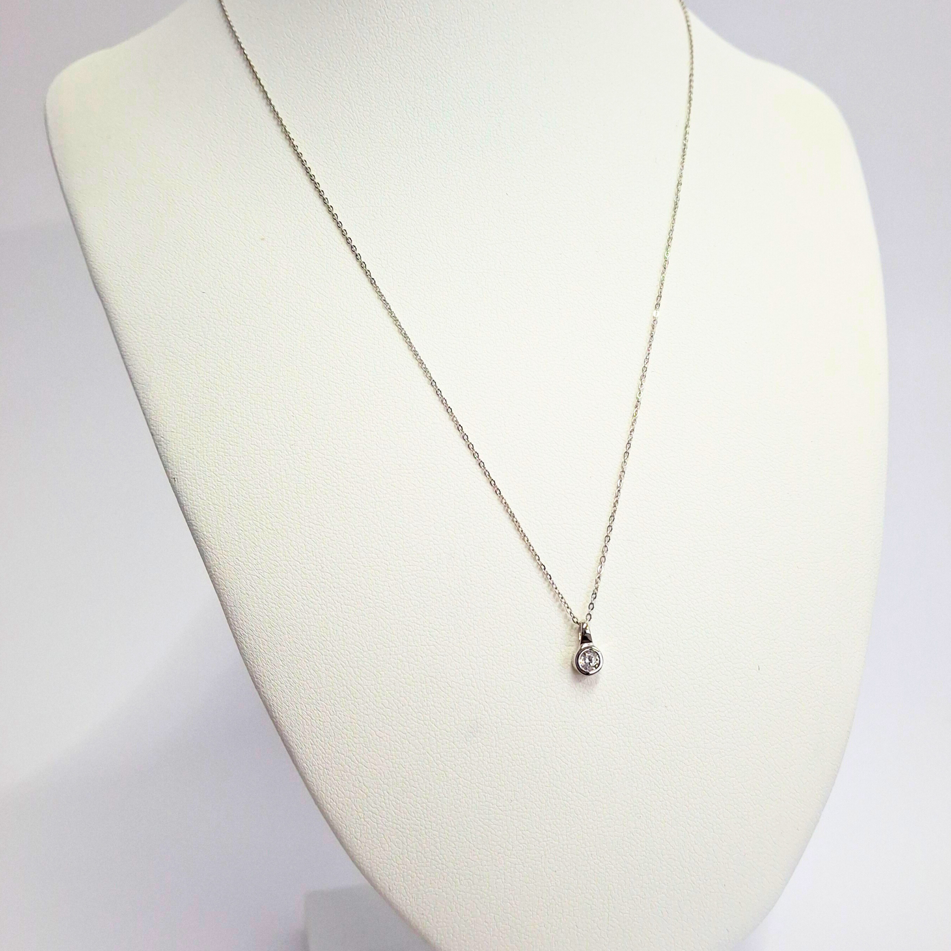 Sofisticado collar elaborado en oro blanco de alta calidad, adornado con un elegante punto de luz con valier de oro blanco en cristales Swarovski.