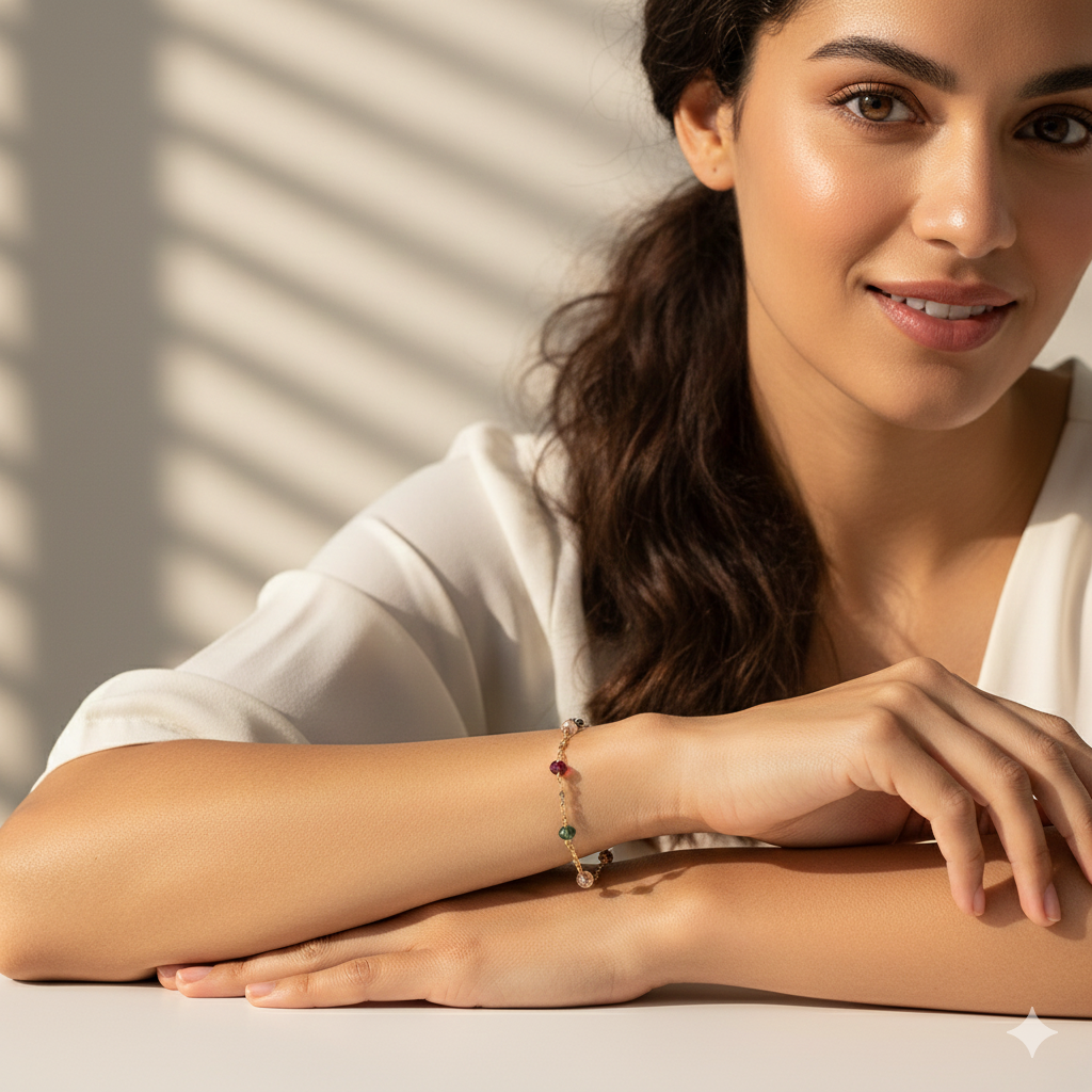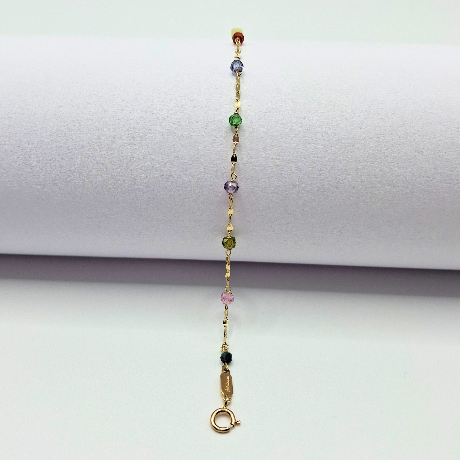 Pulsera con gemas de colores en oro italiano 18k, diseño elegante y lleno de luz. Cada gema aporta un toque vibrante y colorido, ideal para complementar cualquier look con estilo y sofisticación. Terminación de alta calidad, hipoalergénica y cómoda para uso diario.